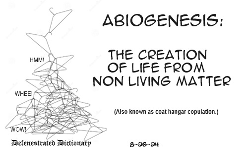 Abiogenesis: The creation of life from non-living matter. (Also known as coat hanger copulation.)