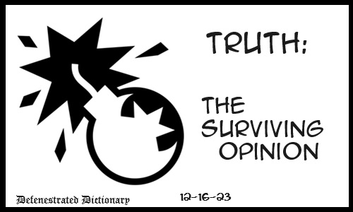 Truth: a. What remains when woke wakes. b. the surviving opinion. c. The new hate speech. d. Obs. – “During times of universal deceit, telling the truth becomes a revolutionary act.” – George Orwell